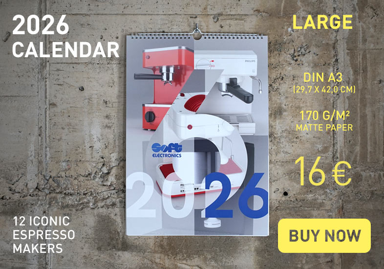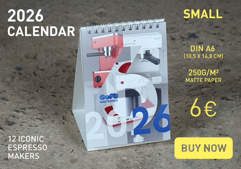 The 2026 calendar shows a selection of 12 iconic espresso makers. Available in large A3 and small A6 from 6€ plus shipping.